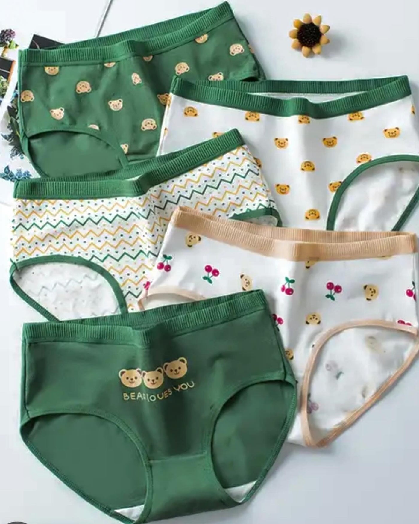 • Pack of 5 Cotton Panties – Stylish prints with bears, cherries, and zig-zag design.