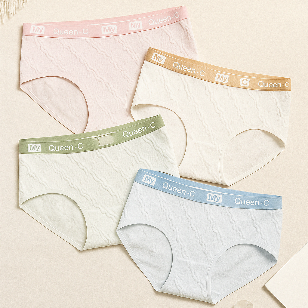Upgrade your lingerie collection with this pack of 5 premium cotton panties for women, designed for all-day comfort, breathability, and style. Made from super-soft cotton fabric with a subtle wave texture, these panties come in pastel colors with a stylish “My Queen” elastic waistband that adds both comfort and elegance.